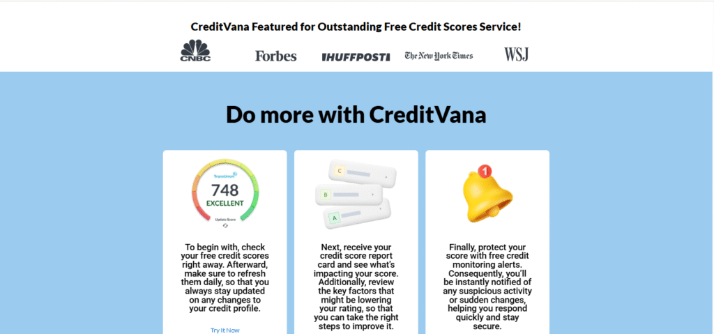 CreditVana is a platform (website/app) that promises free credit scores and credit monitoring. According to their site, you can: